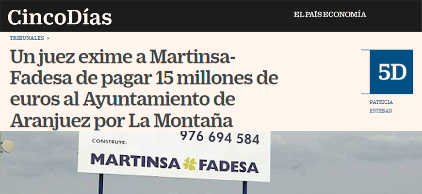 El Juzgado de lo Contencioso-Administrativo número 8 de Madrid ha absuelto a Martinsa-Fadesa del pago de 15.448.656 euros al Ayuntamiento de Aranjuez por los gastos de mantenimiento e impuestos de la urbanización La Montaña ubicada en el municipio desde 2010 hasta 2021. El juez considera nulo el decreto de 2 de agosto de 2021 del ayuntamiento por el que se reclamaba este montante a la malograda constructora.