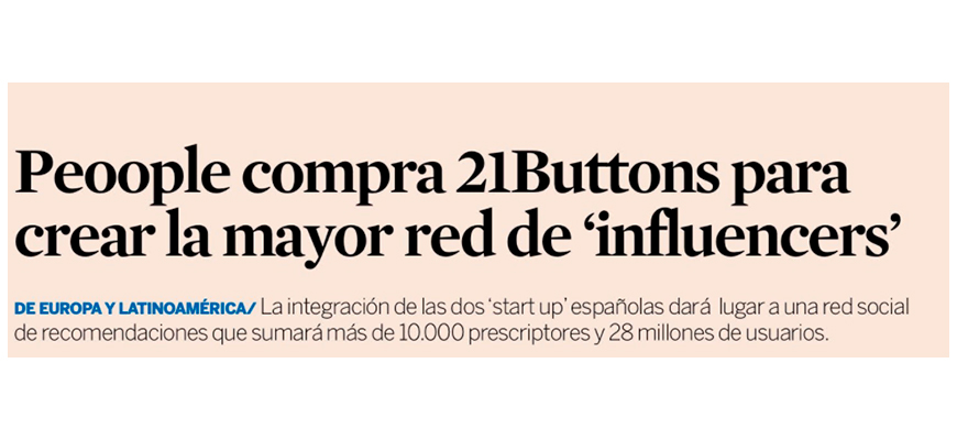 Andersen ha asesorado a Peoople, start-up española basada en una red social de recomendaciones, en la compra de la start-up catalana 21Buttons, red social de moda con presencia en España y Latinoamérica, que pasará a integrarse dentro de Peoople.