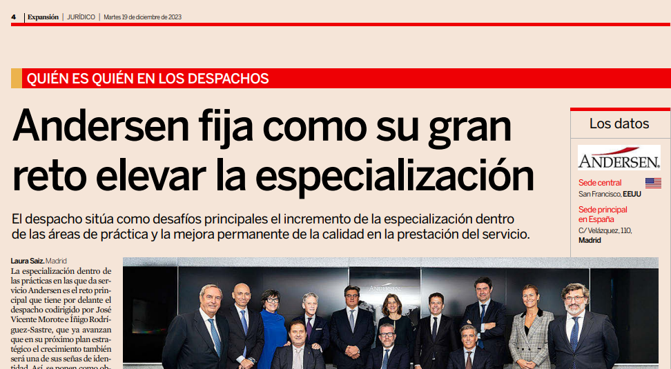 La especialización dentro de las prácticas en las que da servicio Andersen es el reto principal que tiene por delante el despacho codirigido por José Vicente Morote e Íñigo Rodríguez-Sastre, que ya avanzan que en su próximo plan estratégico el crecimiento también será una de sus señas de identidad. Así, se ponen como objetivo alcanzar los 100 millones de ingresos en tres años.
