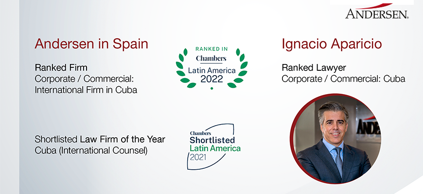 El directorio jurídico Chambers & Partners ha destacado a Andersen como firma internacional recomendada en el área de Corporate/Commercial del ranking de Cuba que se incluye en la guía Chambers Latin America 2022, que también reconoce a Ignacio Aparicio, socio de la firma y director del Cuban desk, en el ranking individual.