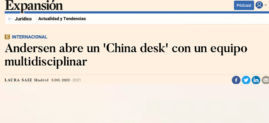 Andersen ha puesto en marcha el China Desk de Andersen Iberia como punto de referencia en el negocio bidireccional con el país asiático con el objetivo de fortalecer las relaciones comerciales entre empresas chinas y españolas y, además, será el coordinador en Europa de esta iniciativa, canalizando todas las oportunidades en este ámbito para y desde el resto de los países europeos que conforman Andersen.