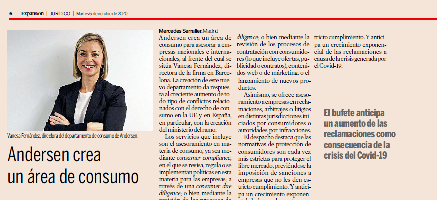 Tras el reciente nombramiento de José Vicente Morote e Íñigo Rodríguez-Sastre como Socios Codirectores de Andersen en España, la firma se abre a un nuevo mercado con un departamento dirigido a empresas que tengan contacto directo con consumidores. La creación de este departamento, novedoso en España, y liderado por Vanesa Fernández, Director en la firma, dará respuesta al creciente aumento de todo tipo de conflictos relacionados con el derecho de consumo.