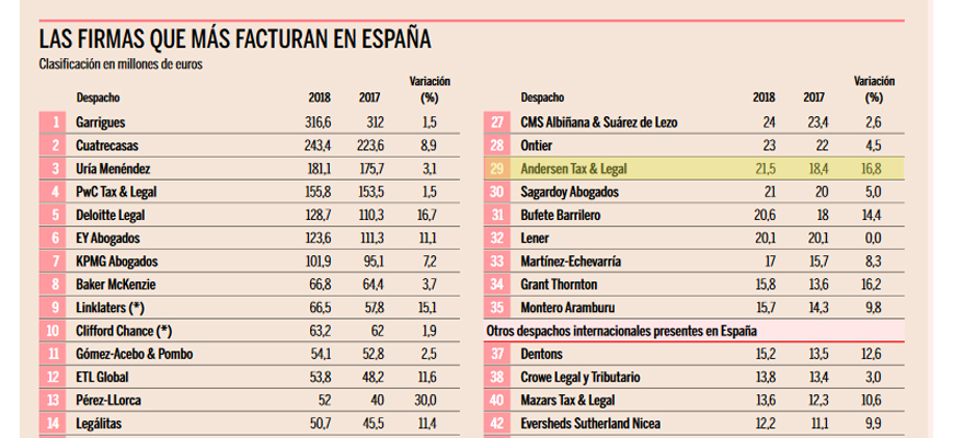 Andersen Tax & Legal se encuentra posicionado en el ranking de la firmas que más facturan en España, con un 17% de crecimiento en 2018 respecto al año anterior, un incremento de letrados de un 25% y un aumento de plantilla de un 14%, la firma con lo que se posiciona entre las primeras firmas en la evolución de las plantillas en España durante 2018, según el último ranking de despachos de abogados del diario Expansión.