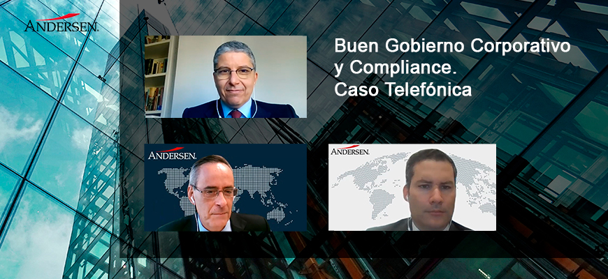 Así se puso de manifiesto webinar “Buen Gobierno Corporativo y Compliance” organizado desde Andersen en España y en colaboración con Telefónica, en el que expertos de ambas organizaciones ofrecieron, desde un enfoque práctico, una visión del Compliance en grandes empresas, recomendaciones y ejemplos sobre la utilidad del gobierno corporativo. El evento contó con Manuel Crespo de la Mata, Chief Compliance Officer de Grupo Telefónica, que explicó el caso desde la perspectiva de la compañía, y con José Ignacio Olleros, Socio de Andersen, y Santiago Fuertes, Director en la firma.