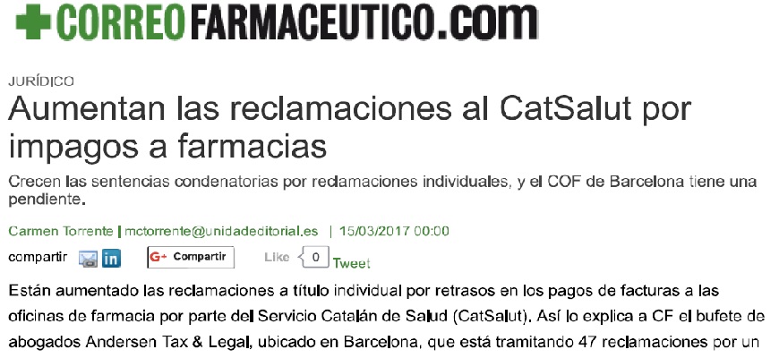 Están aumentado las reclamaciones a título individual por retrasos en los pagos de facturas a las oficinas de farmacia por parte del Servicio Catalán de Salud (CatSalut). Así lo explica a CF el bufete de abogados Andersen Tax & Legal, ubicado en Barcelona, que está tramitando 47 reclamaciones por un importe de 318.346 euros, de las cuales ya tienen 12 sentencias. "Diez de ellas son favorables y sólo una es claramente contraria a considerar legitimado al farmacéutico a título individual", explica José Luis Aguilar, director del bufete.