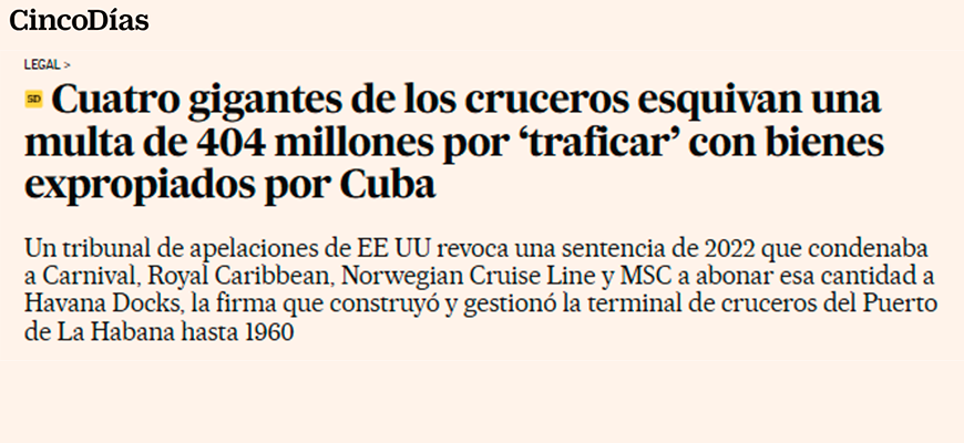Inicio / Conocimiento / Noticias / Cuatro gigantes de los cruceros esquivan una multa de 404 millones por ‘traficar’ con bienes expropiados por Cuba