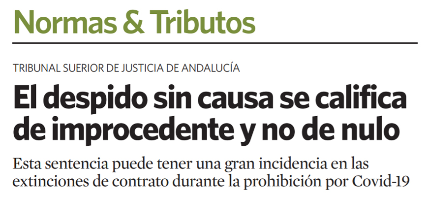 A este respecto, Alfredo Aspra, socio del Departamento Laboral de Andersen, explica que se trata de una sentencia imprescindible por su trascendencia, de una gran relevancia. Estima que el despido sin causa es improcedente y nunca puede ser declarado nulo. Serviría en pro de esta tesis, sin juzgarlo en sí, que los despidos del artículo 2 del Real Decreto- Ley 9/2020 (prohibición de despido en legislación laboral Covid-19) deben calificarse improcedentes y no nulos.