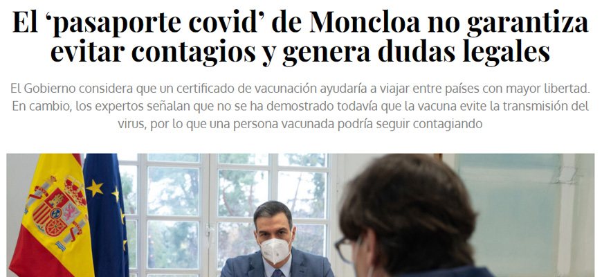 El Gobierno ha expresado en múltiples ocasiones su apoyo a la implantación de un 'pasaporte covid', un certificado que facilite los viajes internacionales a las personas que ya se hayan vacunado. El presidente del Gobierno, Pedro Sánchez, lo hizo por última vez el pasado jueves: "El movimiento transfronterizo de personas es esencial para la continuidad de las empresas y de otras actividades clave y por ello encontrar la forma de promover viajes internacionales de forma segura debe seguir siendo nuestra prioridad".