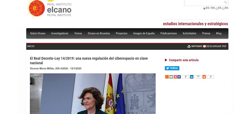 Dentro de este proceso general para la regulación de la soberanía digital de los Estados y la gobernanza del ciberespacio, el Real Decreto Ley (RDL) 14/2019 responde a la necesidad de regular la realidad digital para evitar su uso ilegítimo y poner en riesgo la seguridad nacional. Aprobado por el Consejo de Ministros y convalidado por el Congreso de los Diputados, espera ahora su trámite como Proyecto de Ley.