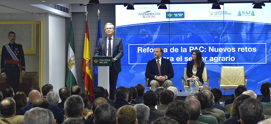 La jornada la inauguró Concepción Cobo, Secretaria General de Fondos Europeos al Desarrollo Rural Sostenible, José Luis García-Palacios, Presidente de Caja Rural del Sur, y José Manuel Pumar, Socio Director de la oficina de Sevilla de Andersen Tax & Legal, y continuó con la exposición sobre las inquietudes del sector por parte del Presidente de ASAJA-Andalucía, Ricardo Serra, y el Presidente de Cooperativas Agro-alimentarias de Andalucía, Juan Rafael Leal, y el análisis de la PAC y postura de la UE por parte de Gregorio Dávila, de la Dirección General de Agricultura y Desarrollo Rural de la Comisión Europea.
