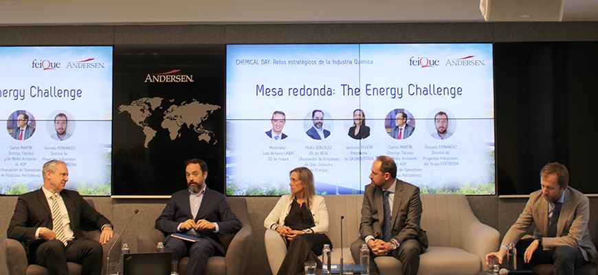 El evento ha contado con la participación de Carles Navarro, consejero delegado de BASF y vicepresidente de Feique; José Ignacio Olleros, Of Counsel de Andersen; Robert Fellner-Feldegg, CEO de NOAH Unternehmensgruppe y Rouven SCHWAB, Socio de Andersen en Alemania. Asimismo, ha acogido la mesa redonda “The Energy Challenge”, moderada por Juan Antonio Labat, director general de Feique, que ha contado con la participación de Pedro González, Director General de AEGE (Asociación de Empresas de Gran Consumo de Energía); Verónica Rivière, presidenta de GasIndustrial; Carlos Martín, director técnico y de Medio Ambiente de AOP (Asociación de Operadores de Productos Petrolíferos) y Gonzalo Fernández, director de Proyectos Industriales de Fertiberia de Fertiberia.