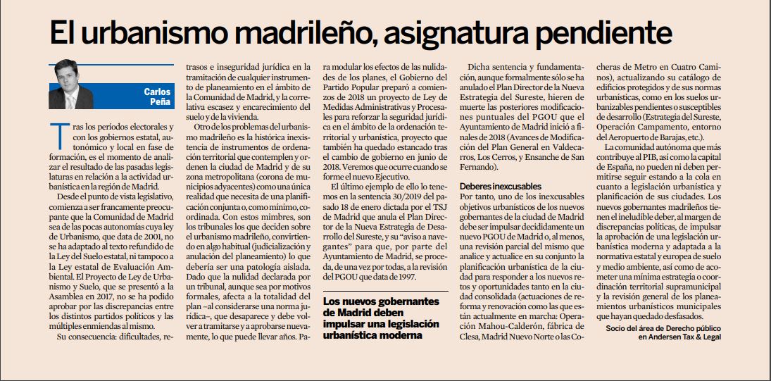 La comunidad autónoma que más contribuye al PIB, así como la capital de España, no pueden ni deben permitirse seguir estando a la cola en cuanto a legislación urbanística y planificación de sus ciudades. Los nuevos gobernantes madrileños tienen el ineludible deber, al margen de discrepancias políticas, de impulsar la aprobación de una legislación urbanística moderna y adaptada a la normativa estatal y europea de suelo y medio ambiente, así como de acometer una mínima estrategia o coordinación territorial supramunicipal y la revisión general de los planeamientos urbanísticos municipales que hayan quedado desfasados.