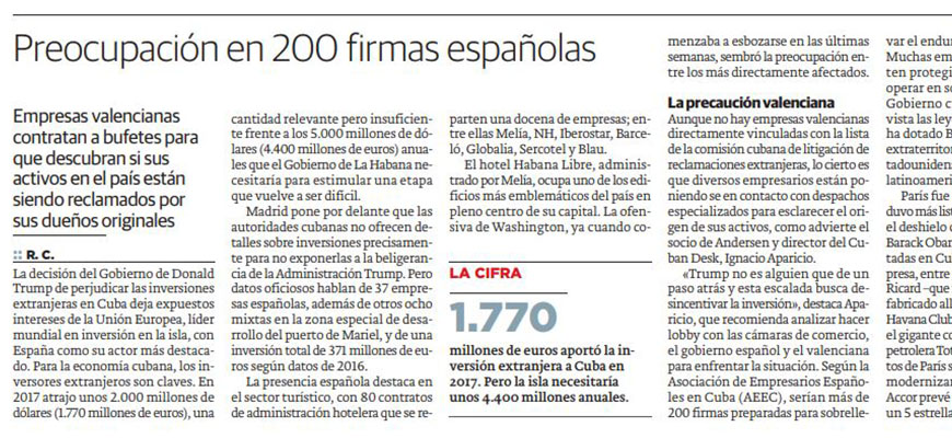 Aunque no hay empresas valencianas directamente vinculadas con la lista de la comisión cubana de litigación de reclamaciones extranjeras, lo cierto es que diversos empresarios están poniendo se en contacto con despachos especializados para esclarecer el origen de sus activos, como advierte el socio de Andersen y director del Cuban Desk, Ignacio Aparicio. "Trump no es alguien que de un paso atrás y esta escalada busca desincentivar la inversión", destaca Aparicio, que recomienda analizar hacer lobby con las cámaras de comercio, el gobierno español y el valenciana para enfrentar la situación. Según la Asociación de Empresarios Españoles en Cuba (AEEC), serían más de 200 firmas preparadas para sobrellevar el endurecimiento del bloqueo. Muchas empresas europeas se sienten protegidas en cierto modo por operar en sociedades mixtas con el Gobierno cubano. Y no pierden de vista las leyes antídoto de las que se ha dotado Bruselas para combatir la extraterritorialidad de la obsesión estadounidense con Cuba y sus aliados latinoamericanos.