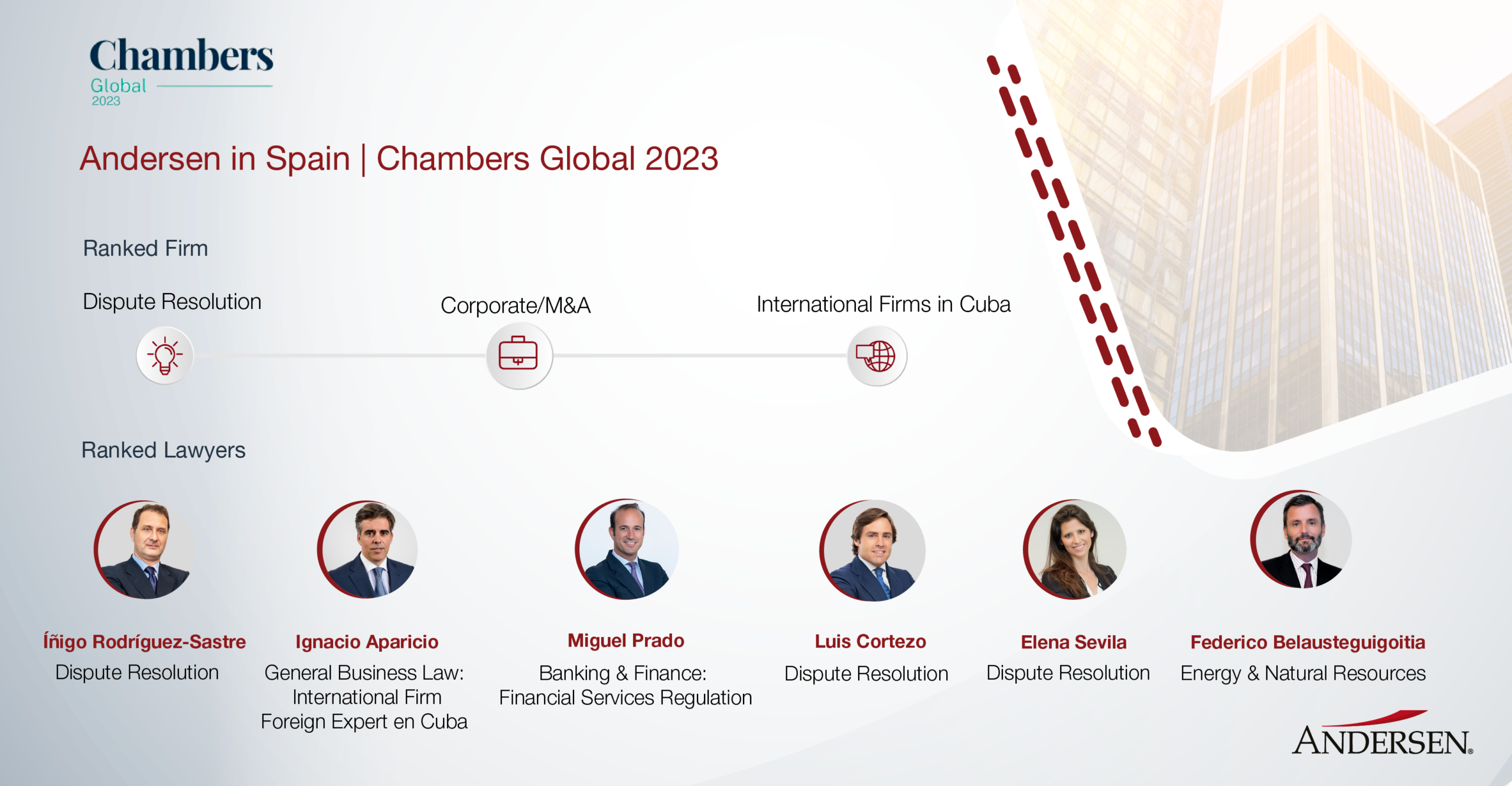 The legal directory Chambers & Partners has highlighted Andersen as a recommended firm in the areas of Dispute Resolution, Corporate / M&A and General Business Law as an International Firm in Cuba in the new edition of the Chambers Global 2023 guide.
