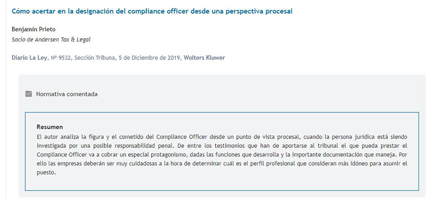- Of all these testimonies, the one that the Compliance Officer can give is going to be a special protagonist, because given the functions that this organ develops and the important documentation that it handles, its call to the process will be almost inevitable and its declaration will often be decisive to elucidate whether or not there is criminal responsibility of the legal person. Therefore, companies must be very careful when determining which professional profile they consider most suitable to assume the position.
