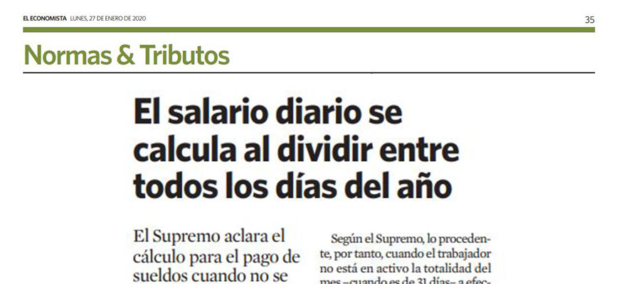 The Supreme Court clarifies that the daily wage for the payment of monthly wages when the whole month isn’t worked must be calculated by dividing the annual wage by the 365 days of the year. The Supreme Court, in its ruling of 25 November 2019, thus recalls its doctrine in cases of workers who have not been active for the whole month during the 31-day period, because they were temporarily unfit to work and joined the company once the month had begun, because they started working after the month had begun or because they joined the company after a period of leave after the month had begun.