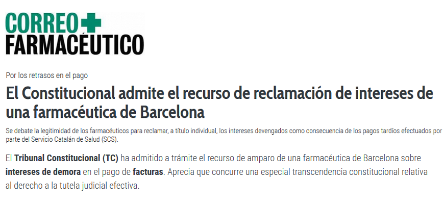 On October 15, 2018, the Constitutional Court admitted for processing the Appeal for Amparo filed by José Luis Aguilar, partner of Andersen Tax & Legal, filed by a pharmacist in Barcelona to appreciate that there is a special constitutional significance relating to the right to effective judicial protection. Specifically, the legitimacy of pharmacists to claim, on an individual basis, the interest accrued as a result of late payments made by the Servei Català de la Salut (Catalan Health Service), in relation to those invoices that are charged to that Public Entity is debated. This lack of legitimacy is since the Pharmacy Offices are not part of the Agreement signed between the Servei Català de la Salut and the Consell de Col-legis Farmacèutics de Catalunya (Council of Pharmaceutical Colleges of Catalonia) and, therefore, only the College could claim compliance with the payment obligation arising from the Concert d'Atenció Farmacèutica (Pharmaceutical Attention Agreement) and the corresponding delay interest.