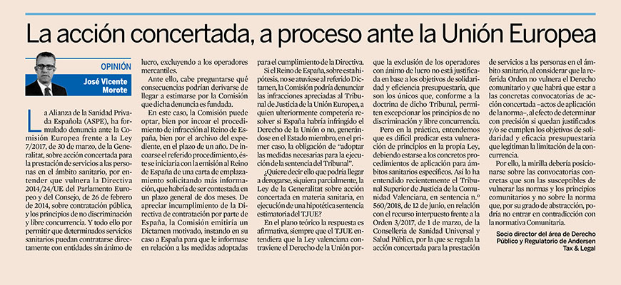 The Spanish Private Health Alliance (ASPE) has filed a complaint with the European Commission against Law 7/2017, on 30th March, of the Generalitat, on concerted action for the provision of services to people in the health sector, on the grounds that it violates Directive 2014/24/EU of the European Parliament and of the Council, of 26th February 2014; on public procurement and the principles of non-discrimination and free competition. This is to enable certain health services to be contracted directly with non-profit organisations, to the exclusion of commercial operators.