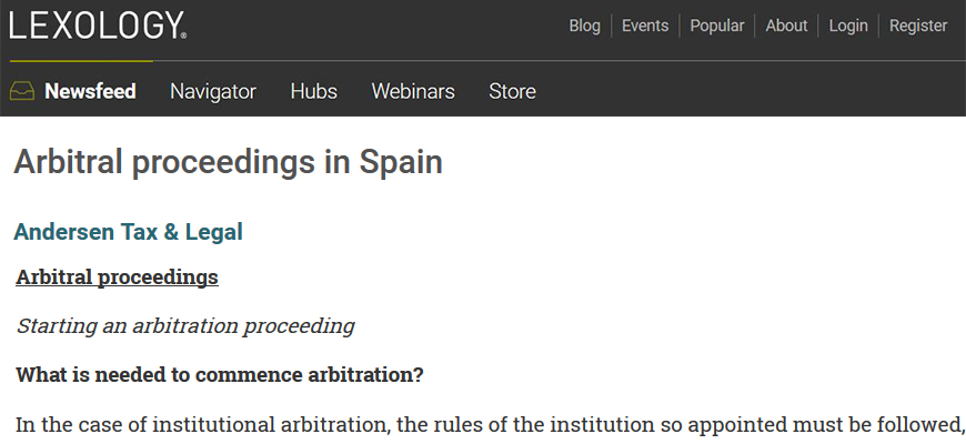Iñigo Rodríguez-Sastre, Partner of Andersen Tax & Legal and head of the firm's Litigation, Insolvency and Arbitration practice in the Madrid and Valencia offices, and Elena Sevila, senior associate of this department, analyse arbitral proceedings in Spain in a book that publishes Lexology Navigator.