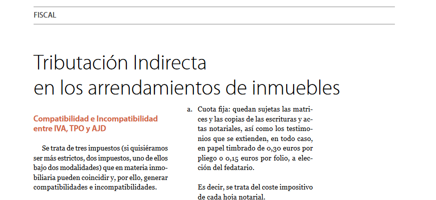 The content of the present article is to offer a broad view of indirect taxation derived from the leasing of real estate, thus entering the field of Value Added Tax (hereinafter, VAT) and Tax on Onerous Transfer of Assets and Documented Legal Acts, in its two forms: Onerous Transfer of Assets (hereinafter, TPO) and Documented Legal Acts (hereinafter, AJDD).