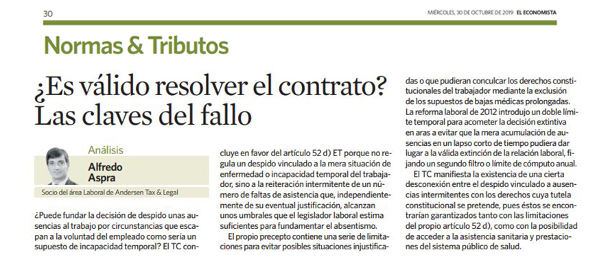 ¿Es válido resolver el contrato de un trabajador tras reiteradas faltas? Las claves del fallo del Tribunal Constitucional | Noticias | Derecho LaboralAlfredo Aspra explica en El Economista que una reiteración intermitente de un número de faltas de asistencia por parte del trabajador puede suponer un despido si estas alcanzan unos umbrales que el legislador laboral estima suficientes para fundamentar el absentismo -