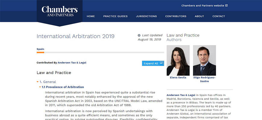 Íñigo Rodríguez-Sastre, Socio del área de Derecho Procesal, Concursal y Arbitraje de Andersen Tax & Legal, y Elena Sevila, Asociado Senior de este departamento, analizan la legislación española en el ámbito del Arbitraje en una segunda edición que publica Chambers & Partners. Los autores, en esta obra realizan una comparativa legal de esta área en las distintas jurisdicciones del mundo.