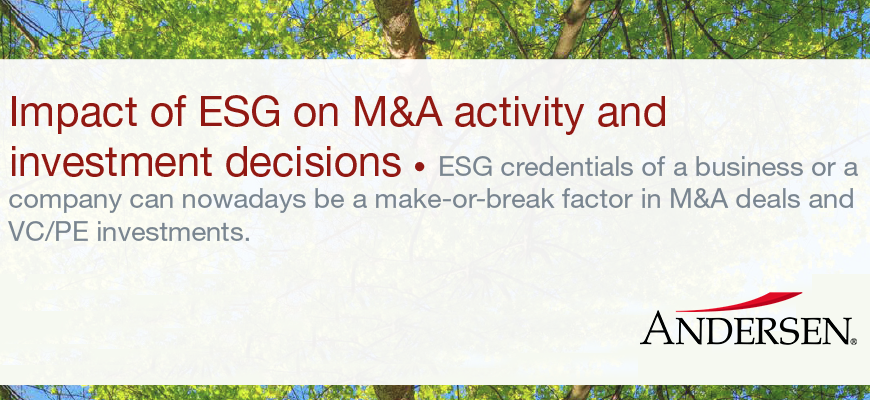 El equipo de M&A de Andersen en Europa analiza la importancia de los criterios ESG en las fusiones y adquisiciones que hoy en día, pueden ser un factor decisivo en las transacciones de M&A. Los negociadores deben ser conscientes de esta tendencia y, además de su revisión, deben incorporar el cumplimiento de los criterios ESG en su análisis.