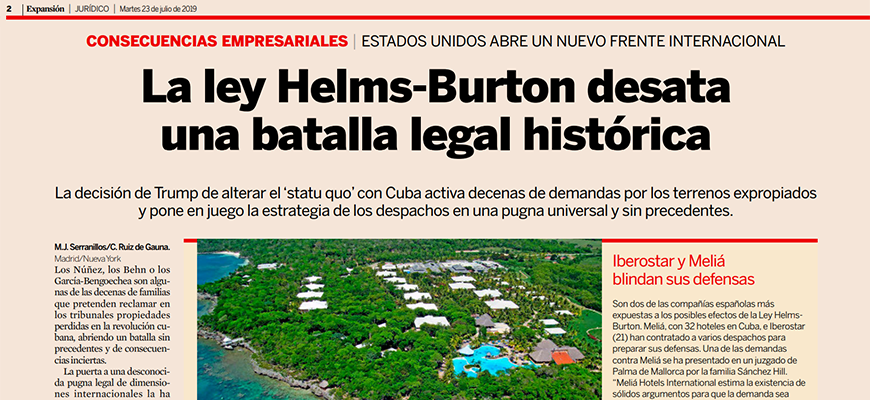 Las hoteleras españolas con presencia en la isla caribeña ya se han puesto en manos de abogados para defenderse de las reclamaciones pidiendo la recuperación de los terrenos donde se asientan sus resorts. Ignacio Aparicio, socio de Andersen Tax & Legal, explica que, “además del estatuto de bloqueo de la UE, la interpretación del concepto de trafficking contenido en la Helms-Burton es amplia”.
