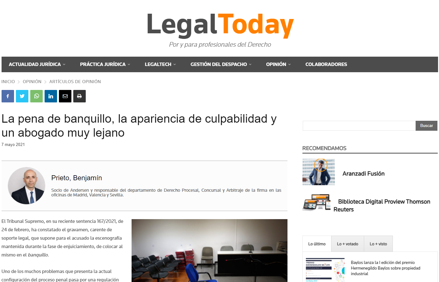 Por eso traemos a colación la reciente sentencia del T.S. antes citada, que, en su Fundamento de Derecho Primero, aborda una de las alegaciones del recurrente que entiende que se produjo una vulneración del derecho a la asistencia letrada efectiva en la medida en que se denegó que el mismo ocupara un lugar en la sala de justicia al lado de su abogado.
