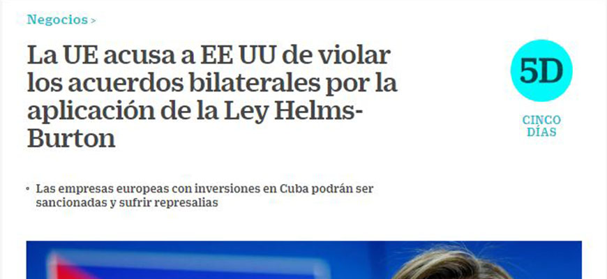 Estados Unidos va contra Cuba por el apoyo de la isla a Venezuela y, como daño colateral, afecta intereses de los países de la Unión Europea, principalmente de España. La vicepresidenta de la Comisión Europea y Alta Representante de Política Exterior, Federica Mogherini, ha acusado a Estados Unidos de violar los acuerdos que firmó con la UE en 1997 y 1998 por la entrada en vigor, a partir de este jueves del título tercero de la Ley Helms-Burton, que abre la puerta a sancionar a empresas que tengan negocios en el país latinoamericano.