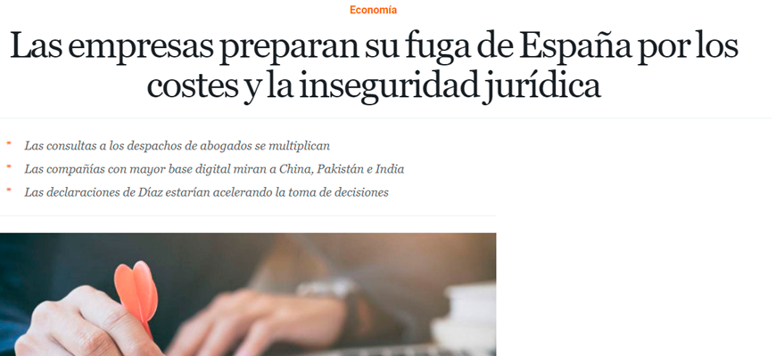 "Este cambio constante crea una inseguridad jurídica que no favorece ni incentiva a empresarios ni empresas a mantenerse o instalarse en el mercado español", incide De la Viña.