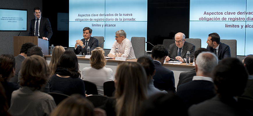Andersen Tax & Legal abordó en el Auditorio de sus oficinas en Madrid durante una jornada específica desarrollada al efecto los aspectos clave derivados de la nueva obligación de registro diario de la jornada con la participación de Vicente Mora, Inspector de Trabajo y Seguridad Social, junto con Alfredo Aspra y José Antonio Sanfulgencio, abogados del Departamento de Derecho Laboral de la Firma.