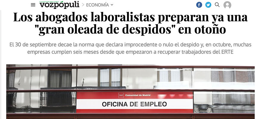 El experto ha detectado también movimiento de compañías que están pendientes de que decaiga el 30 de septiembre la aplicación del artículo 2 del real decreto-ley 9/2020, que impide hacer despidos objetivos por motivos económicos, lo que le hace esperar "una gran oleada de despidos a partir de octubre".