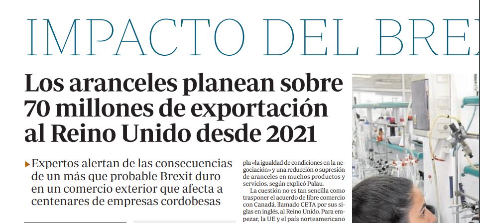 La salida del Reino Unido de la Unión Europea, efectiva desde el 1 de febrero, tendrá consecuencias en todos los órdenes. Las autoridades comunitarias se han esforzado en presentar un Brexit negociado con un divorcio amistoso, frente al guion de «Historia de un matrimonio» esbozado el otoño pasado, con ambas partes cerradas a la negociación. Quizás en el ámbito puramente político el «Brexit blando» haya calado en la sociedad, pero en los aspectos comerciales la realidad apunta lo contrario. Y sólo en Córdoba hay más de 72 millones de euros en juego, la cifra de exportaciones de empresas locales al Reino Unido en 2019. En el ámbito agroalimentario se cuentan 120 empresas afectadas y, en general, el 15% de los exportadores tiene negocios allí y se verá afectado por el Brexit.
