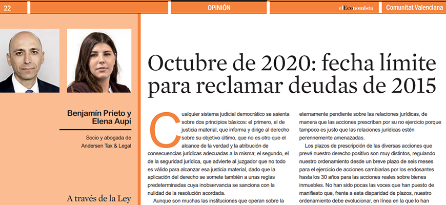 Este plazo de prescripción de 5 años entró en vigor el 6 de octubre de 2015, siendo de plena aplicación a todas las relaciones jurídicas nacidas después de dicha fecha. Las acciones que, sin embargo, podían ya ejercitarse antes de la entrada en vigor de la ley, mantienen el plazo de prescripción de 15 años pero con una fecha límite para el ejercicio de todas ellas fijada el 7 de octubre de 2020. Ello supone, como ha señalado recientemente el Tribunal Supremo en la sentencia 29/2020 de 20 enero, que “las relaciones jurídicas nacidas entre el 7 de octubre de 2005 y el 7 de octubre de 2015, prescribirán el 7 de octubre de 2020”.