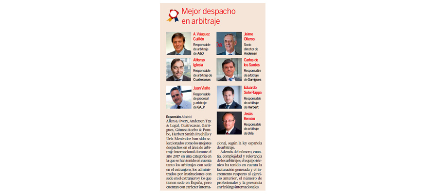 Andersen Tax & Legal ha sido seleccionado por Expansión Jurídico como uno de los mejores despachos en el área de arbitraje internacional durante el año 2017.