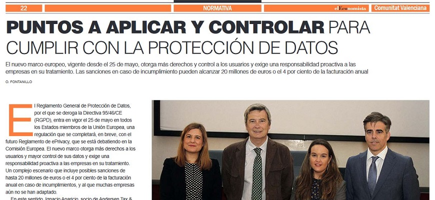 En este sentido, Ignacio Aparicio, socio de Andersen Tax & Legal, advierte de que “las compañías deben adoptar medidas necesarias para cumplir con el Reglamento y estar en disposición de demostrar que se están aplicando”. El experto, que participó en la jornada ¿Estamos preparados para la inminente aplicación del RGPD? Nuevos retos ante la normativa europea de protección de datos, organizada por Andersen Tax & Legal y la Fundación de Estudios Bursátiles y Financieros (FEBF) -celebrada en la Bolsa de Valencia-, detalló que “el diseño de las medidas debe ser adecuado al volumen de datos que se gestionan, a la sensibilidad de los mismos y al tratamiento que se hace de ellos”.