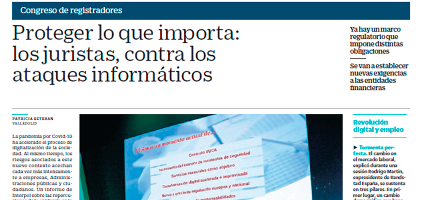 La pandemia por Covid-19 ha acelerado el proceso de digitalización de la sociedad. Al mismo tiempo, los riesgos asociados a este nuevo contexto acechan cada vez más intensamente a empresas, Administraciones públicas y ciudadanos. Los profesionales jurídicos tienen mucho que decir en este campo. En primer lugar, a través del marco regulatorio protector. Por otro lado, adaptándose a los nuevos tiempos usando la tecnología para ofrecer un mejor servicio a los ciudadanos. De estos dos retos se habló durante la segunda jornada del VI Congreso Nacional de Registradores, celebrado la semana pasada en Valladolid bajo la temática de Humanismo y tecnología al servicio de la sociedad.