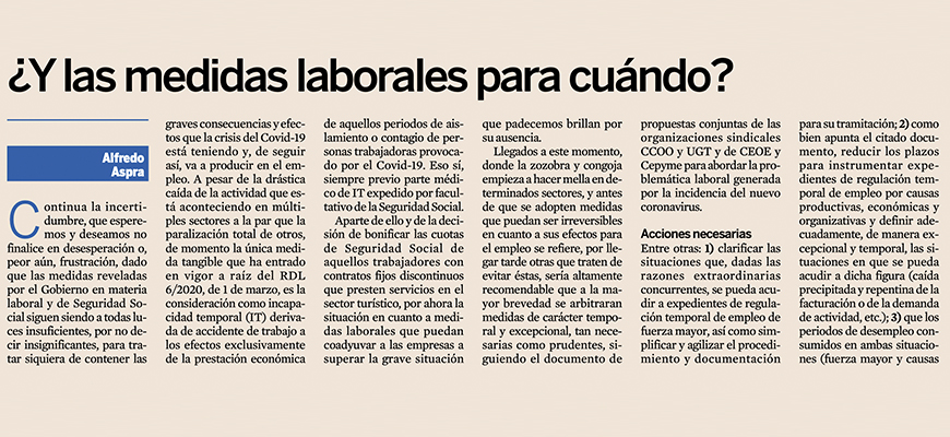 Aparte de ello y de la decisión de bonificar las cuotas de Seguridad Social de aquellos trabajadores con contratos fijos discontinuos que presten servicios en el sector turístico, por ahora la situación en cuanto a medidas laborales que puedan coadyuvar a las empresas a superar la grave situación que padecemos brillan por su ausencia.